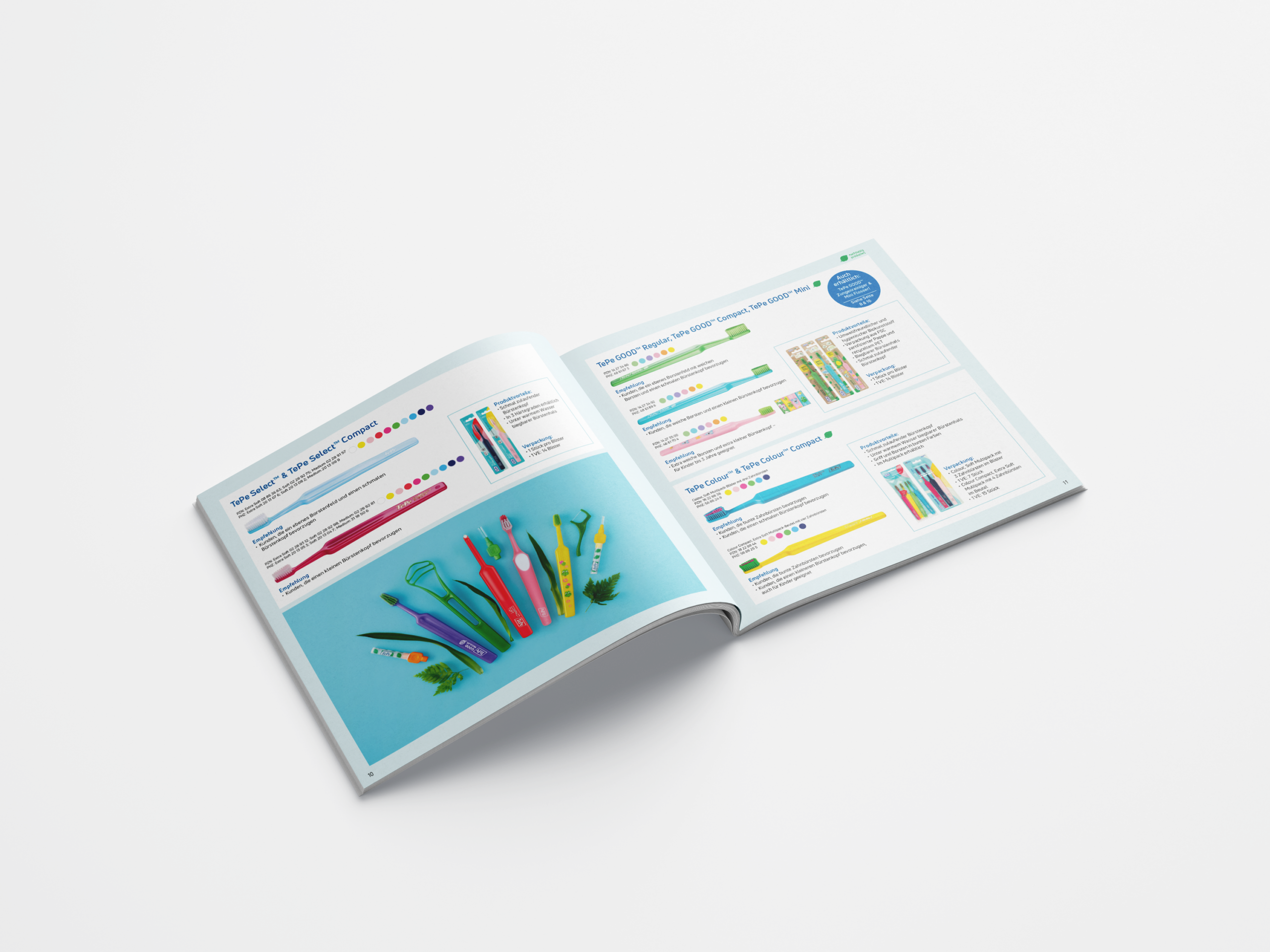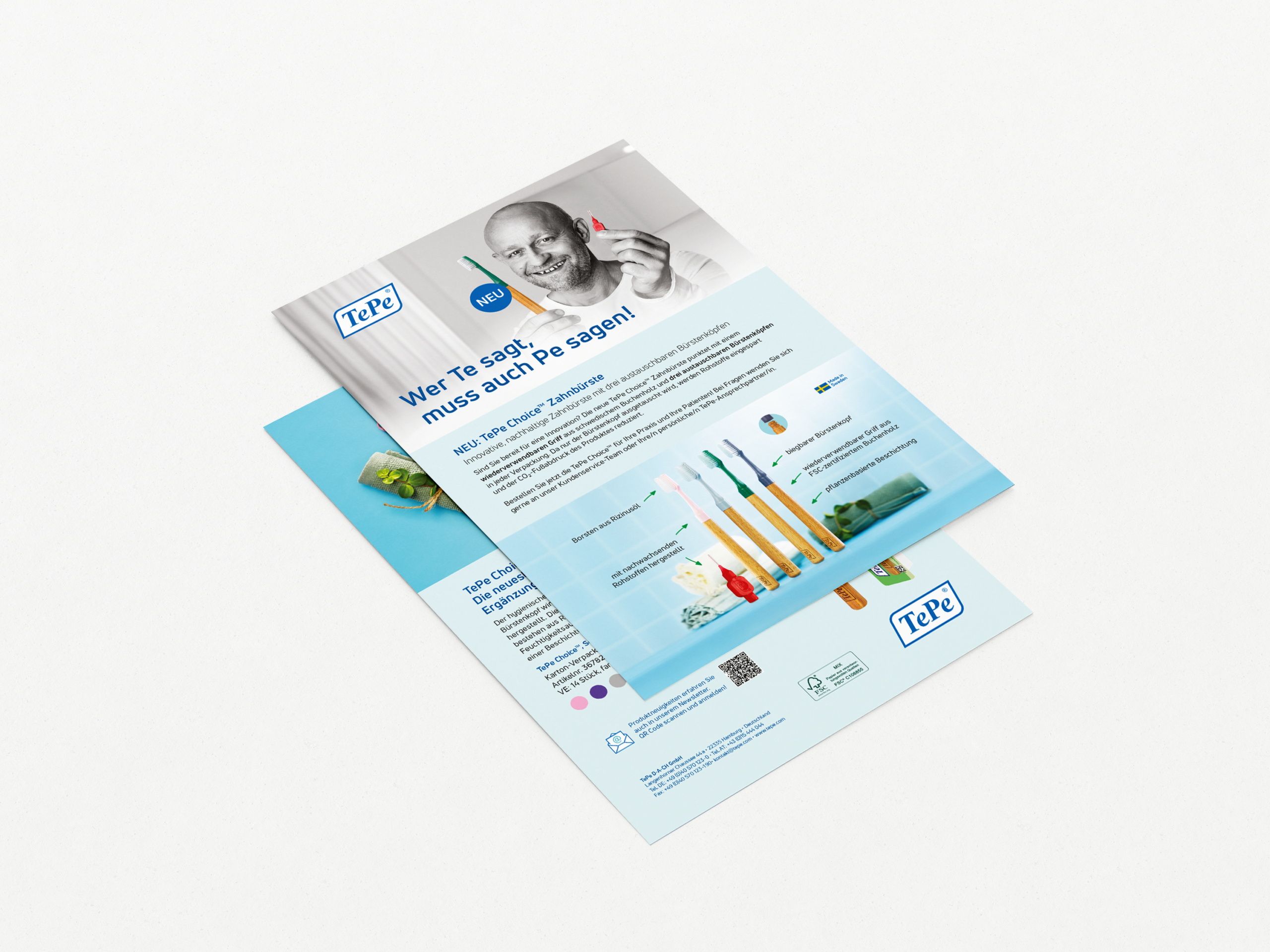 Für die TePe GmbH, spezialisiert auf hochwertige Mundpflegeprodukte, gestalten wir Flyer, Broschüre, Verpackungen und Messestände, die die Produkte und Markenbotschaft klar und ansprechend präsentieren.